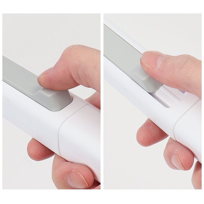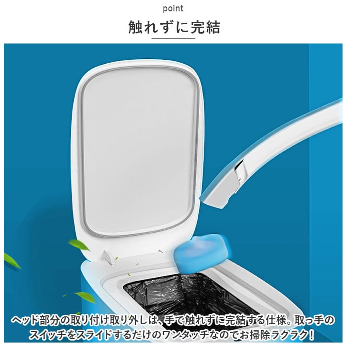 ・ヘッド部分の取り付け取り外しは、手で触れずに完結する仕様。取っ手のスイッチをスライドするだけのワンタッチなのでお掃除ラクラク!