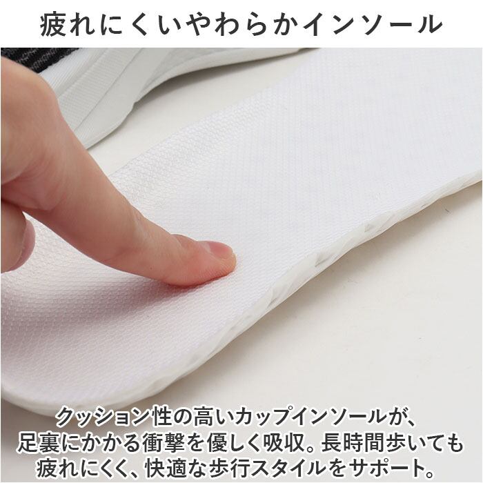 ・クッション性の高いカップインソールが、足裏にかかる衝撃を優しく吸収。長時間歩いても疲れにくく、快適な歩行スタイルをサポート。