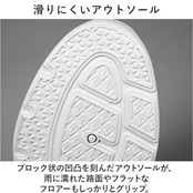・ブロック状の凹凸を刻んだアウトソールが、雨に濡れた路面やフラットなフロアーもしっかりとグリップ。