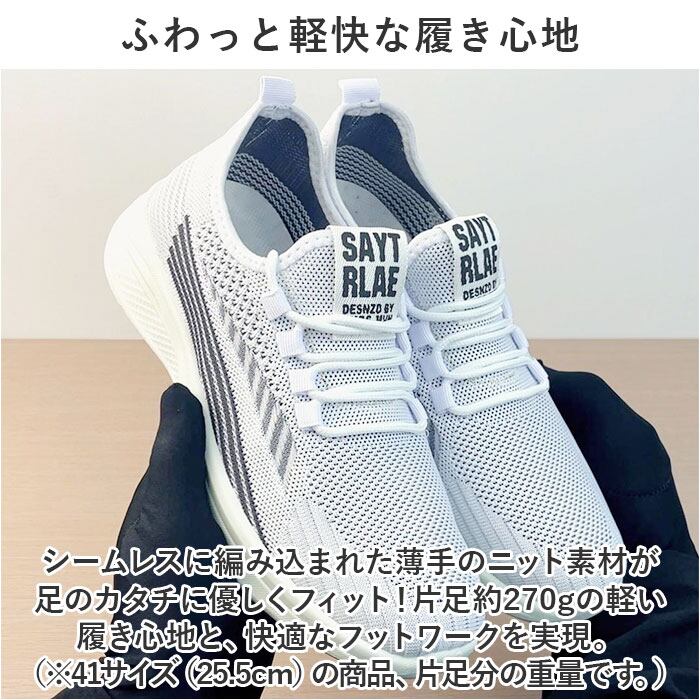 ・シームレスに編み込まれた薄手のニット素材が足のカタチに優しくフィット!片足約270gの軽い履き心地と、快適なフットワークを実現。(※41サイズ(25.5cm)の商品、片足分の重量です。)