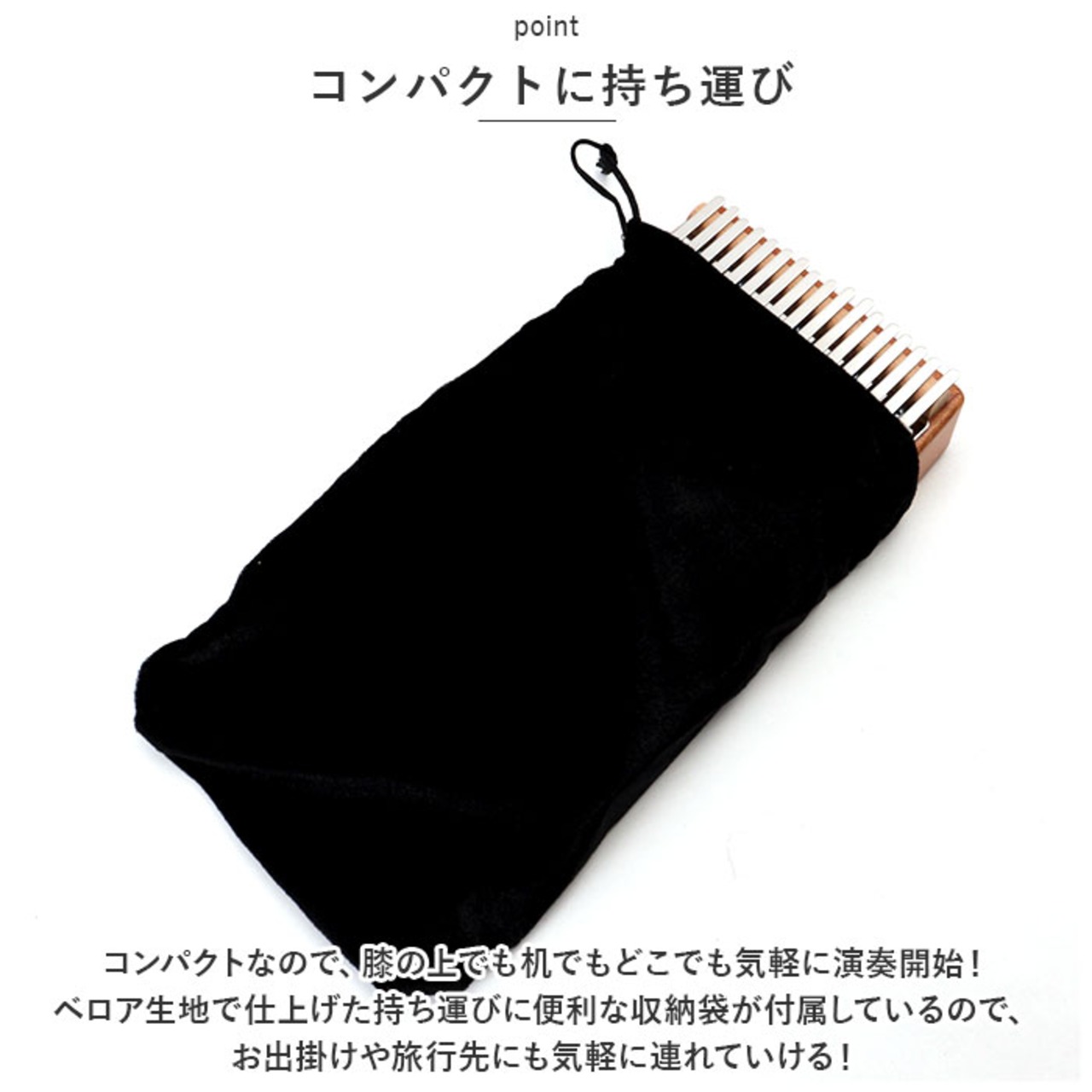 ・膝の上でも机でもどこでも気軽に演奏開始!ベロア生地で仕上げた収納袋が付属しているので、お出掛け先にも気軽に連れていける!