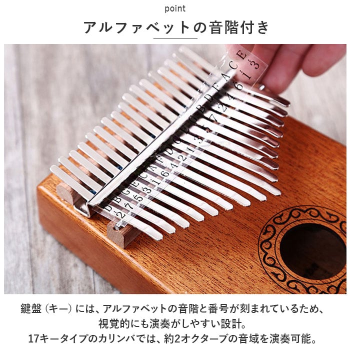 ・鍵盤(キー)には、アルファベットの音階と番号が刻まれているため、視覚的にも演奏がしやすい設計。17キータイプのカリンバでは、約2オクターブの音域を演奏可能。
