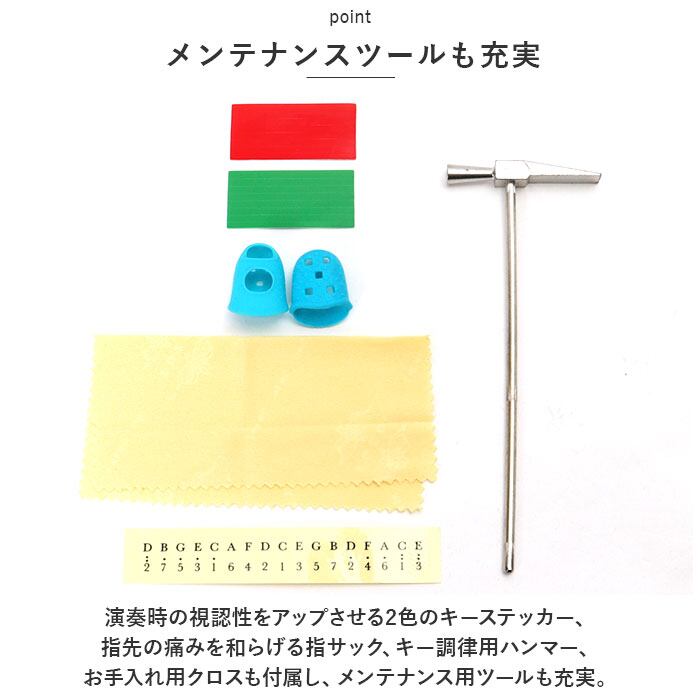 ・演奏時の視認性をアップさせる2色のキーステッカー、指先の痛みを和らげる指サック、キー調律用ハンマー、お手入れ用クロスも付属し、メンテナンス用ツールも充実。