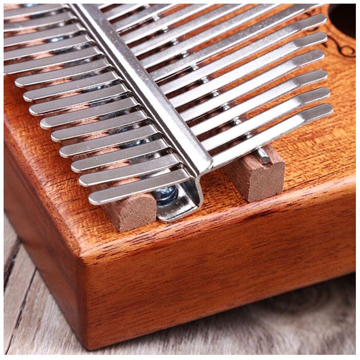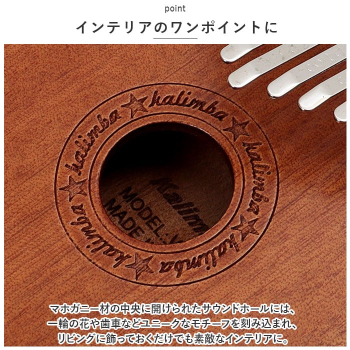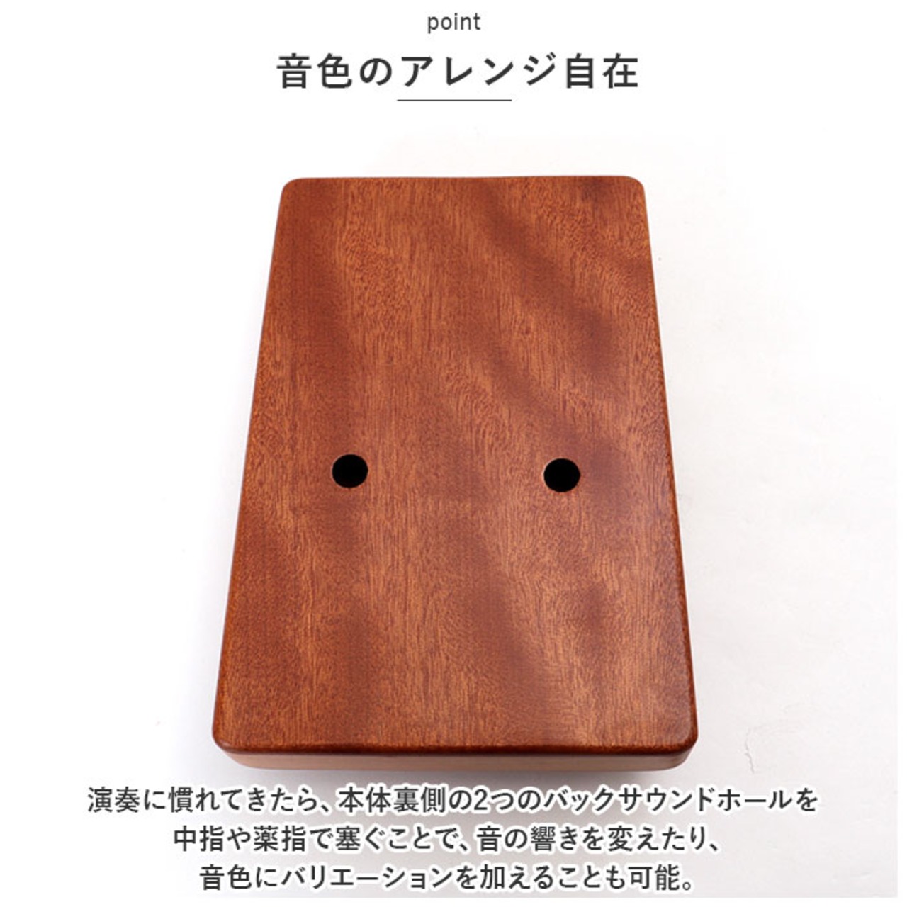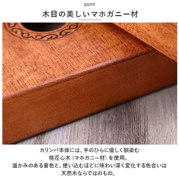 ・カリンバ本体には、手のひらに優しく馴染む桃花心木(マホガニー)を使用。温かみのある音色と、使い込むほどに味わい深く変化する色合いは天然木ならではのもの。