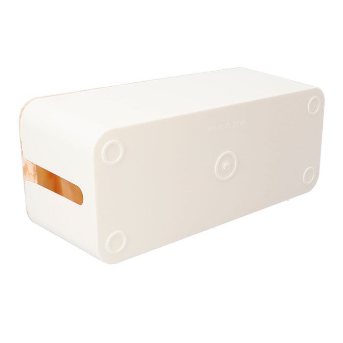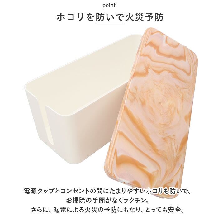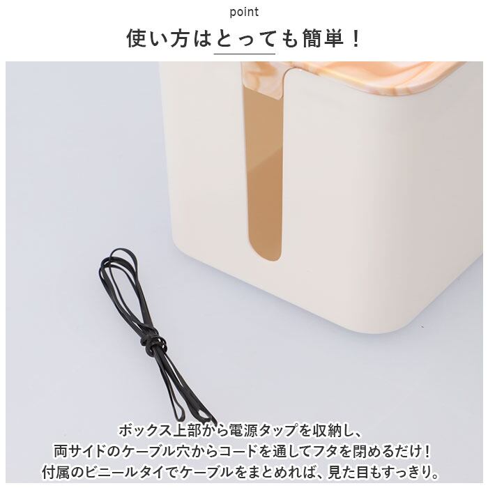 ・ボックス上部から電源タップを収納し、両サイドのケーブル穴からコードを通してフタを閉めるだけ!付属のビニールタイでケーブルをまとめれば、見た目もすっきり。