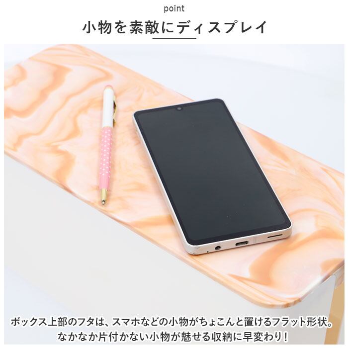 ・ボックス上部のフタは、スマホや腕時計などの小物がちょこんと置けるフラット形状。なかなか片付かない小物が魅せる収納に早変わり!