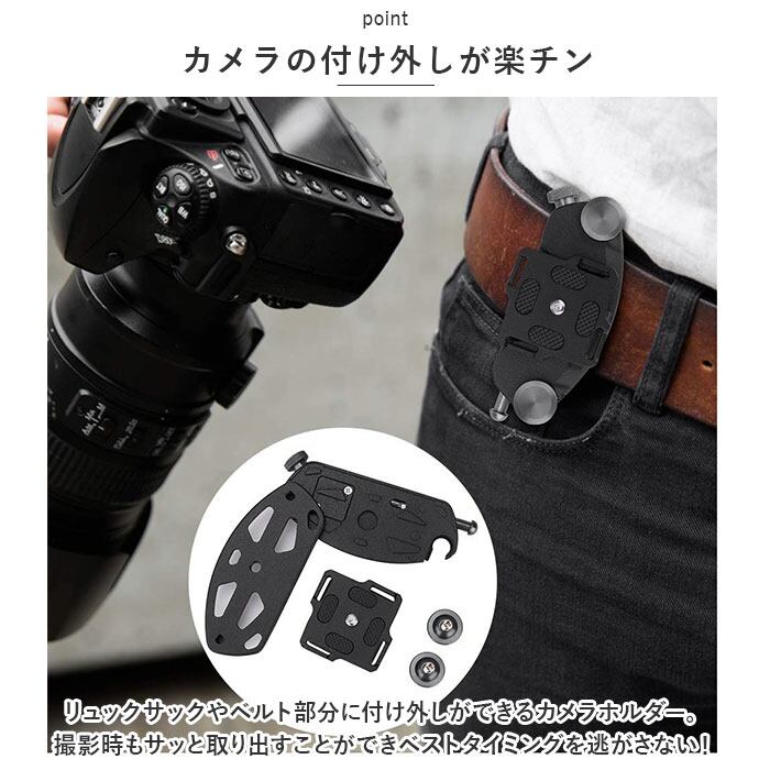 ・リュックサックやベルト部分に付け外しができるカメラホルダー。