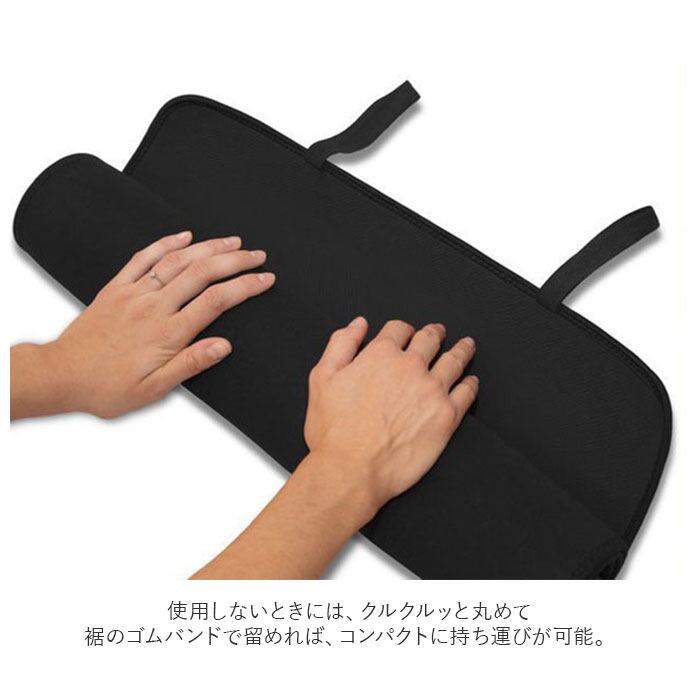 ・使用しないときには、クルクルッと丸めて裾のゴムバンドで留めれば、コンパクトに持ち運びが可能。