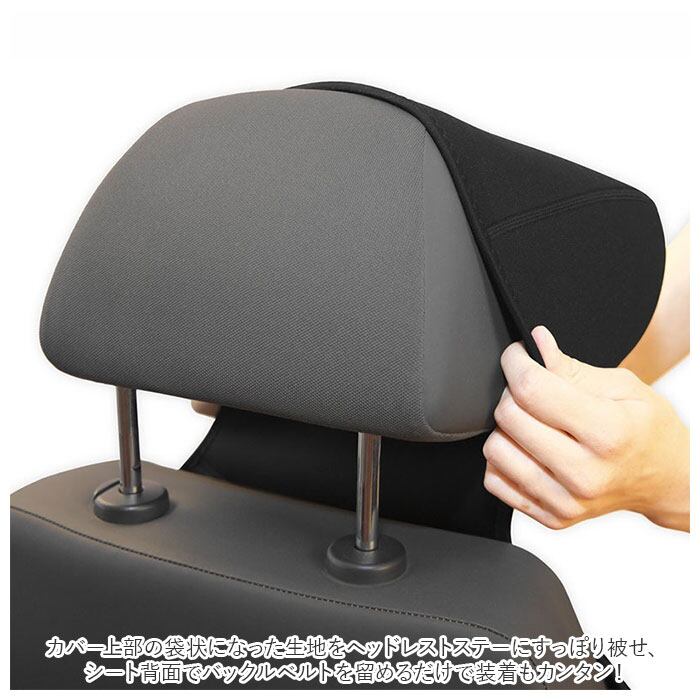 ・カバー上部の袋状になった生地をヘッドレストステーにすっぽり被せ、シート背面でバックルベルトを留めるだけで装着もカンタン!