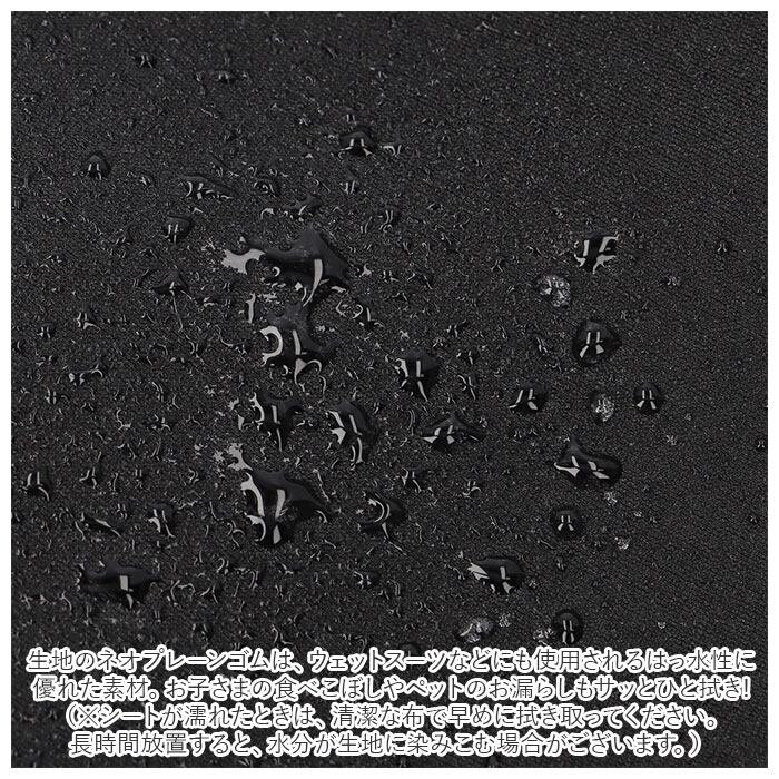 ・生地のネオプレーンゴムは、ウェットスーツなどにも使用されるはっ水性に優れた素材。お子さまの食べこぼしやペットのお漏らしもサッとひと拭きで安心。お子さまやペットとのお出掛けにも大活躍。(※シートが濡れたときは、清潔な布で早めに拭き取ってください。長時間放置すると、水分が生地に染みこむ場合がございます。)