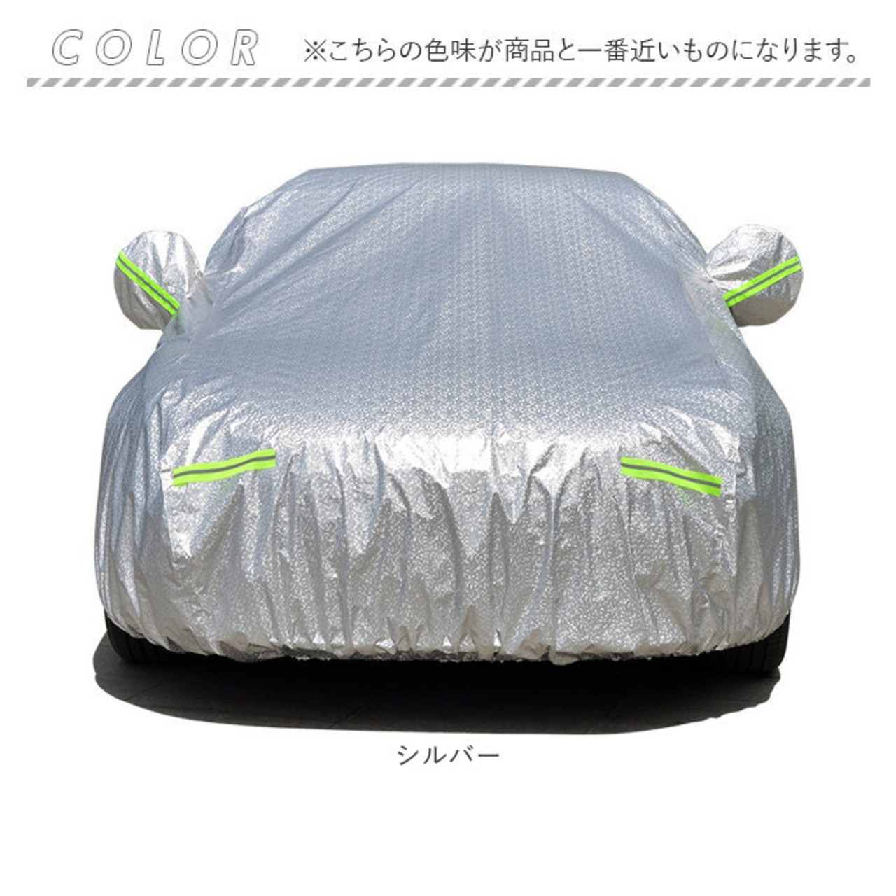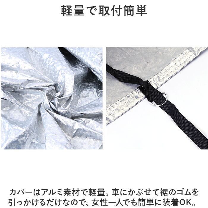 ・カバーはアルミ素材で軽量。車にかぶせて裾のゴムを引っかけるだけなので、女性一人でも簡単に装着OK。