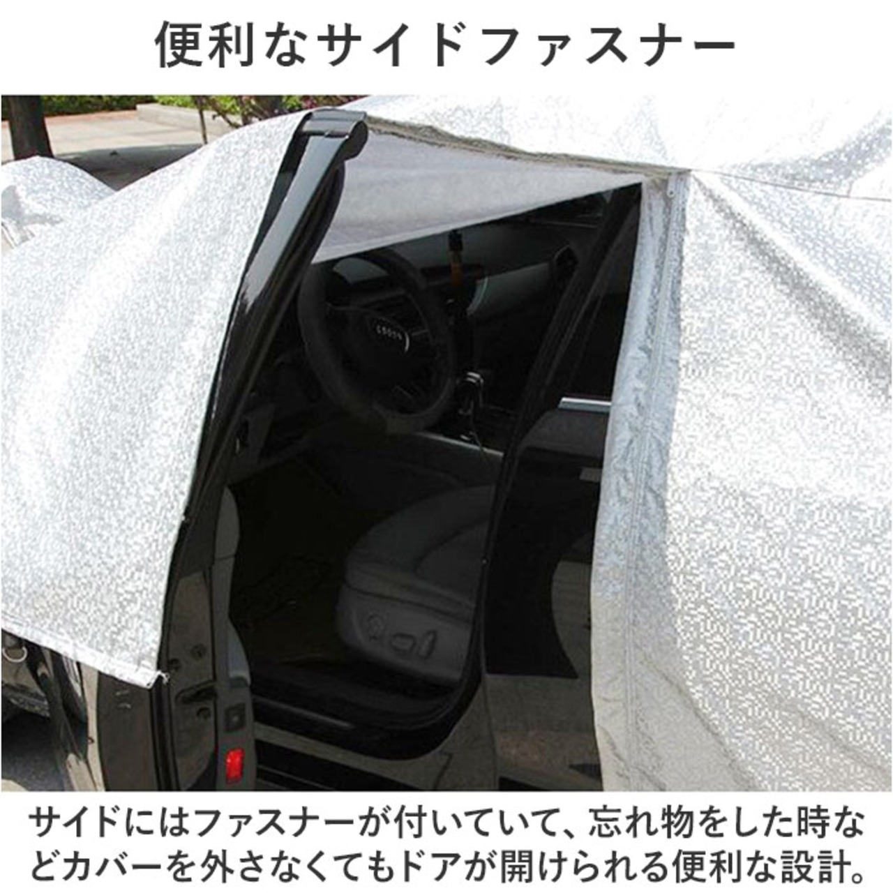 ・サイドにはファスナーが付いていて、忘れ物をした時などカバーを外さなくてもドアが開けられる便利な設計。