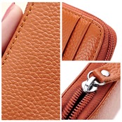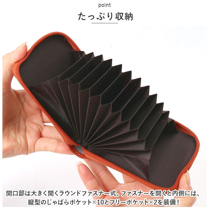 ・開口部は大きく開くラウンドファスナー式。ファスナーを開くと内側には、縦型のじゃばらポケット×10とフリーポケット×2を装備!