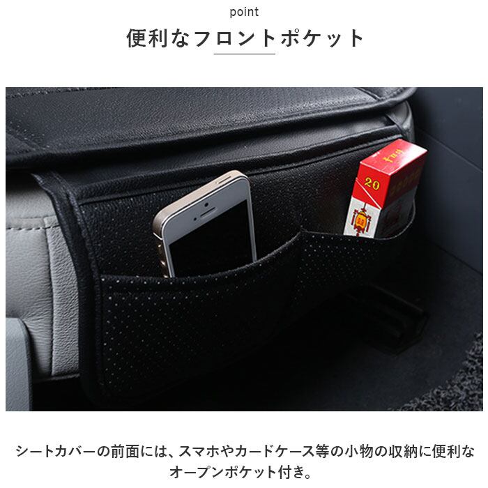 ・シートカバーの前面には、スマホやカードケース等の小物の収納に便利なオープンポケット付き。