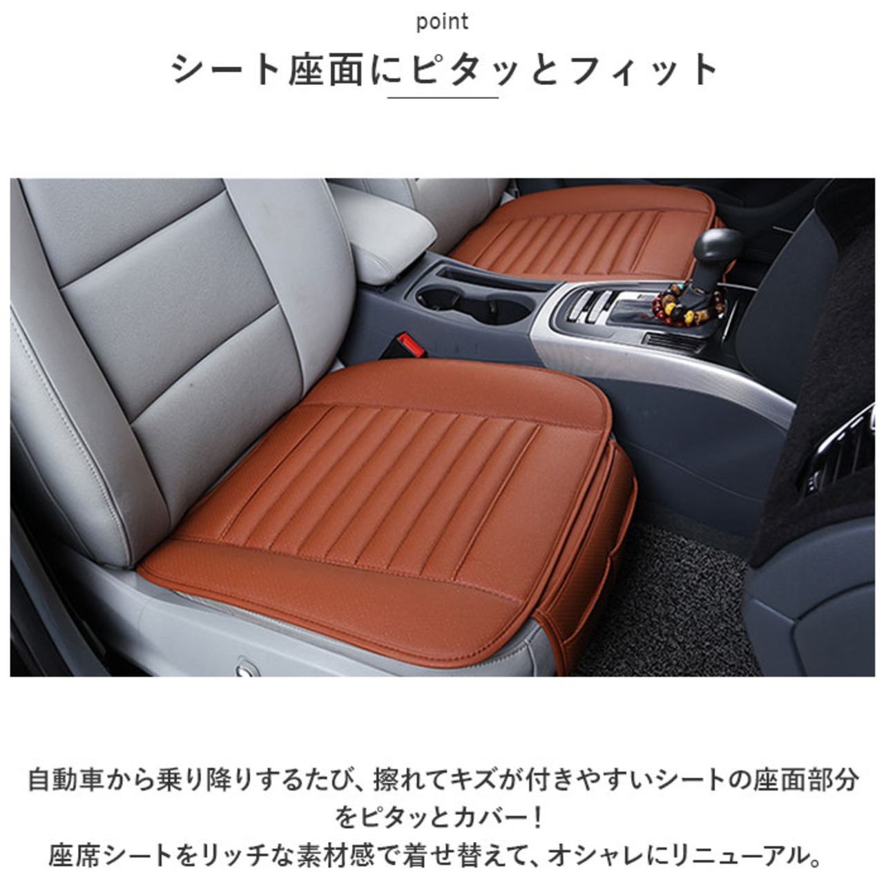 ・自動車から乗り降りするたび、擦れてキズが付きやすいシートの座面部分をピタッとカバー!座席シートをリッチな素材感で着せ替えて、オシャレにリニューアル。