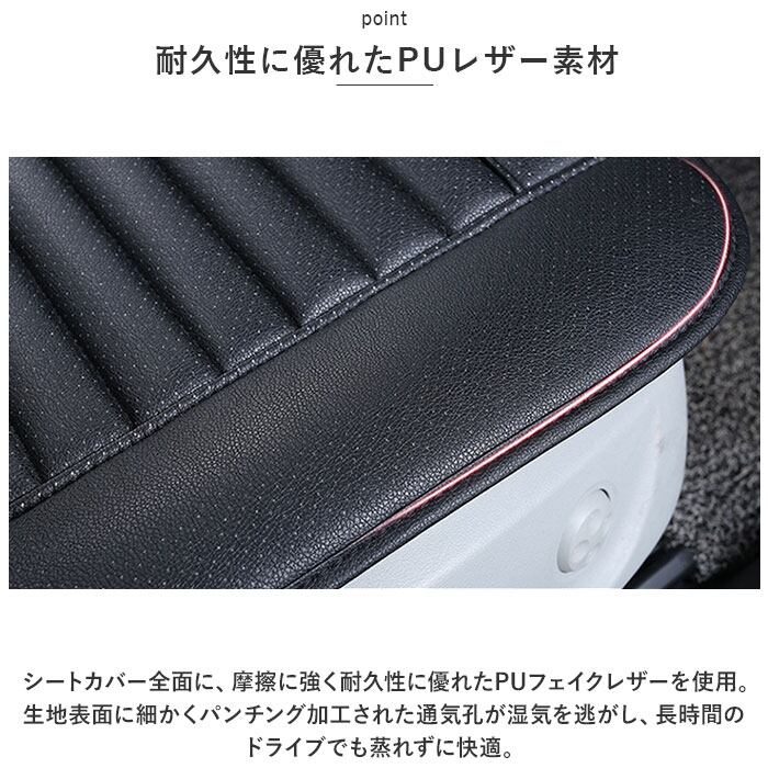 ・シートカバー全面に、摩擦に強く耐久性に優れたPUフェイクレザーを使用。生地表面に細かくパンチング加工された通気孔が湿気を逃がし、長時間のドライブでも蒸れずに快適。