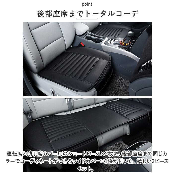 ・運転席と助手席カバー用のショートピース×2枚に、後部座席まで同じカラーでコーディネートができるワイドカバー×1枚が付いた、嬉しい3ピースセット。