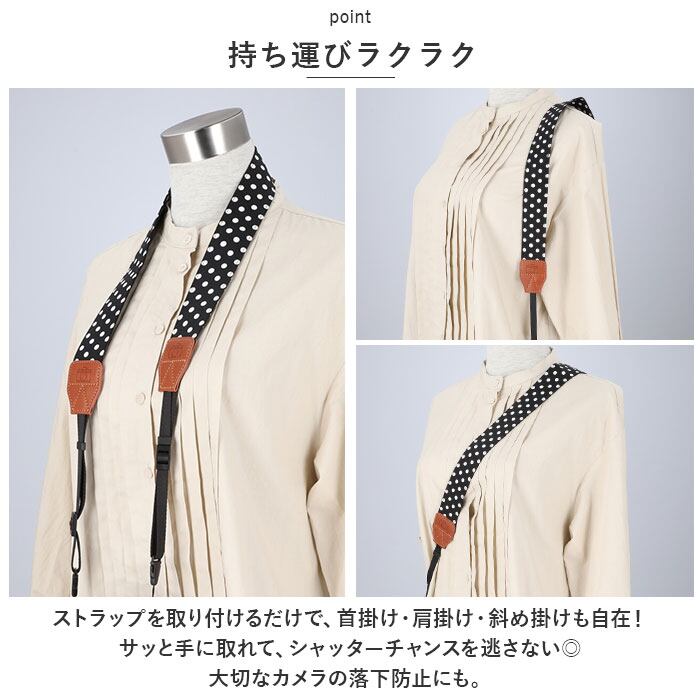 ・ストラップを取り付けるだけで、首掛け・肩掛け・斜め掛けも自在!サッと手に取れて、シャッターチャンスを逃さない◎大切なカメラの落下防止にも。