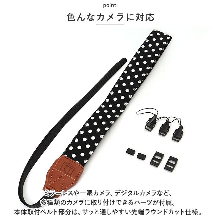 ・ミラーレスや一眼カメラ、デジタルカメラなど、多種類のカメラに取り付けできるパーツが付属。本体取付ベルト部分は、サッと通しやすい先端ラウンドカット仕様。