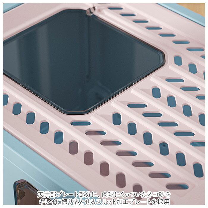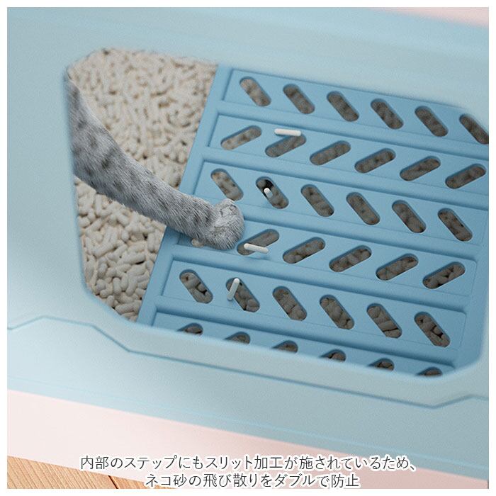 ・天井部プレート部分に、肉球にくっついたネコ砂をキレイに振り落とせるスリット加工プレートを採用。内部のステップにもスリット加工が施されているため、ネコ砂の飛び散りをダブルで防止!