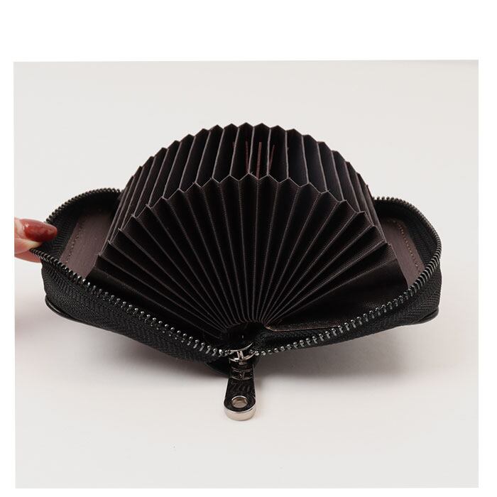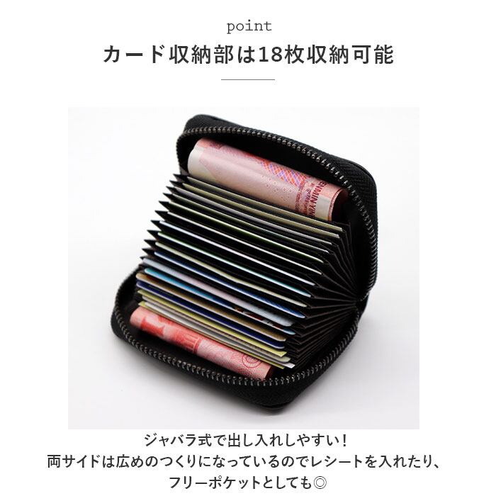 ・カード収納部は18枚収納可能。ジャバラ式で出し入れしやすい!両サイドは広めのつくりになっているのでレシートを入れたり、フリーポケットとしても◎
