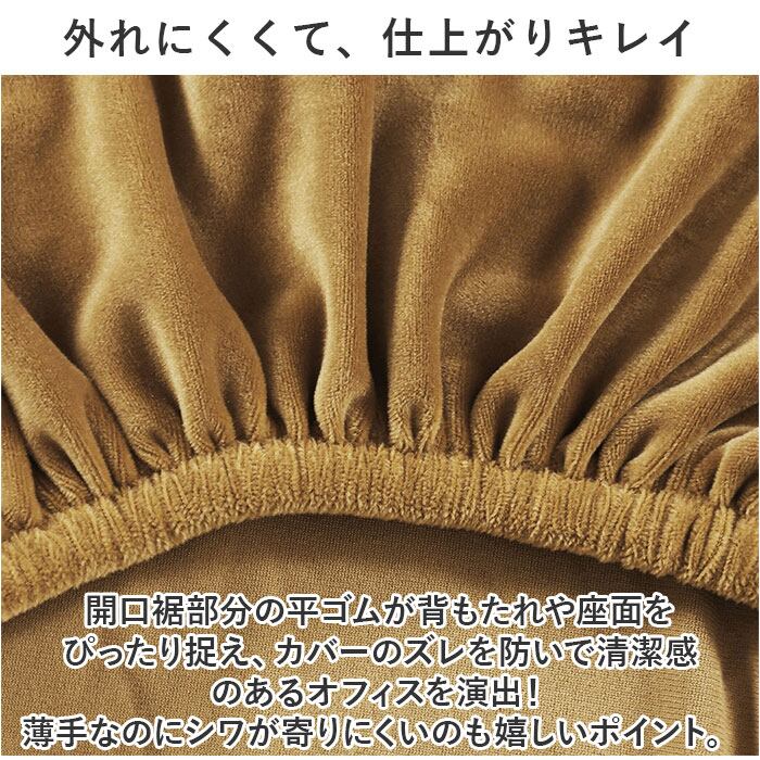 ・開口裾部分の平ゴムが背もたれや座面をぴったり捉え、カバーのズレを防いで清潔感のあるオフィスを演出!薄手なのにシワが寄りにくいのも嬉しいポイント。