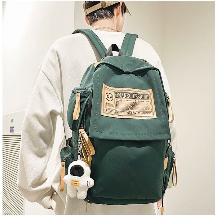 ・ほのかに光沢のあるソリッドカラーの生地に、ベージュ色のフェイクレザーパーツが明るく映える、大人カジュアルな雰囲気が魅力。アフタースクールも素敵にコーデができるシンプルなユニセックスデザイン。