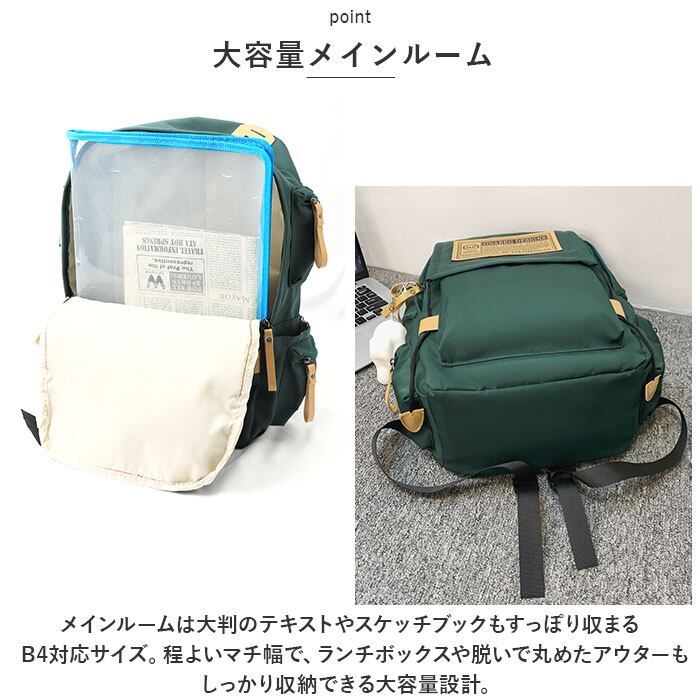 ・メインルームは大判のテキストやスケッチブックもすっぽり収まるB4対応サイズ。程よいマチ幅で、ランチボックスや脱いで丸めたアウターもしっかり収納できる大容量設計。