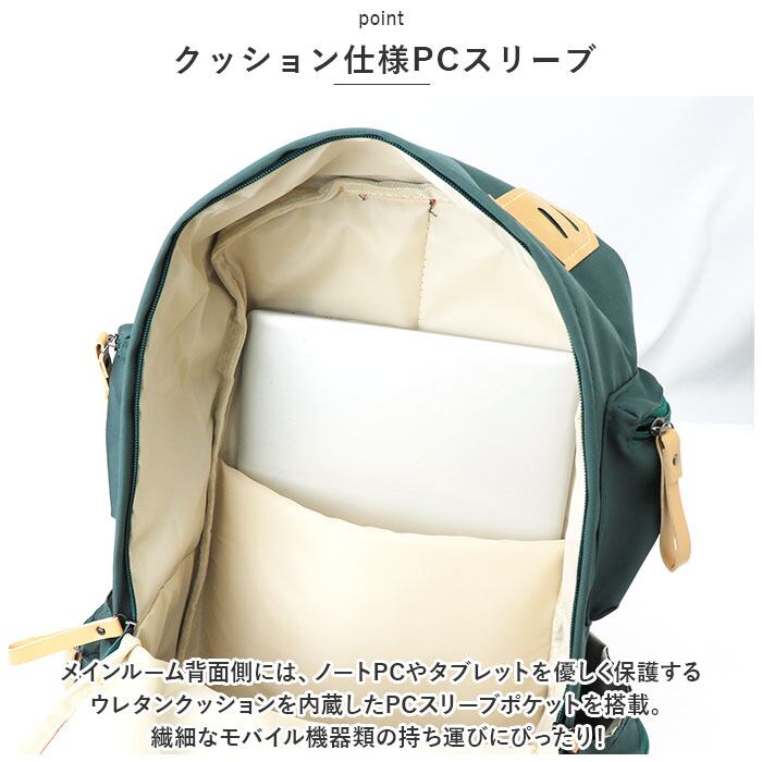 ・メインルーム背面側には、ノートPCやタブレットを優しく保護するウレタンクッションを内蔵したPCスリーブポケットを搭載。繊細なモバイル機器類の持ち運びにぴったり!