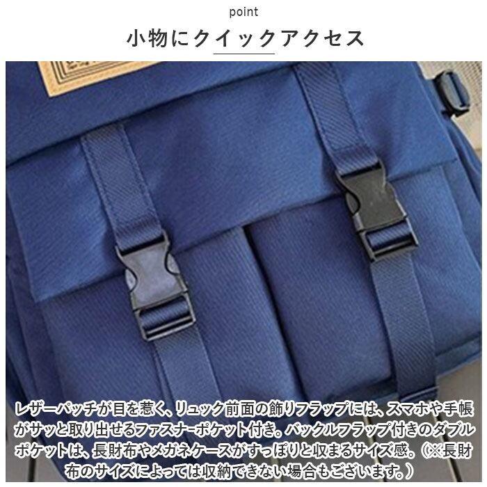 ・レザーパッチが目を惹く、リュック前面の飾りフラップには、スマホや手帳がサッと取り出せるファスナーポケット付き。バックルフラップ付きのダブルポケットは、長財布やメガネケースがすっぽりと収まるサイズ感。(※長財布のサイズによっては収納できない場合もございます。)