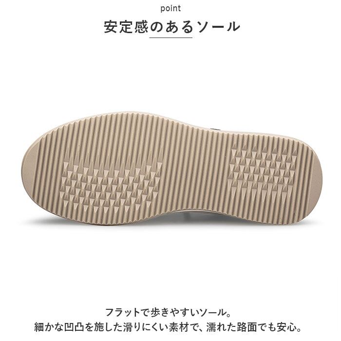・フラットで歩きやすいソール。細かな凹凸を施した滑りにくい素材で、濡れた路面でも安心。