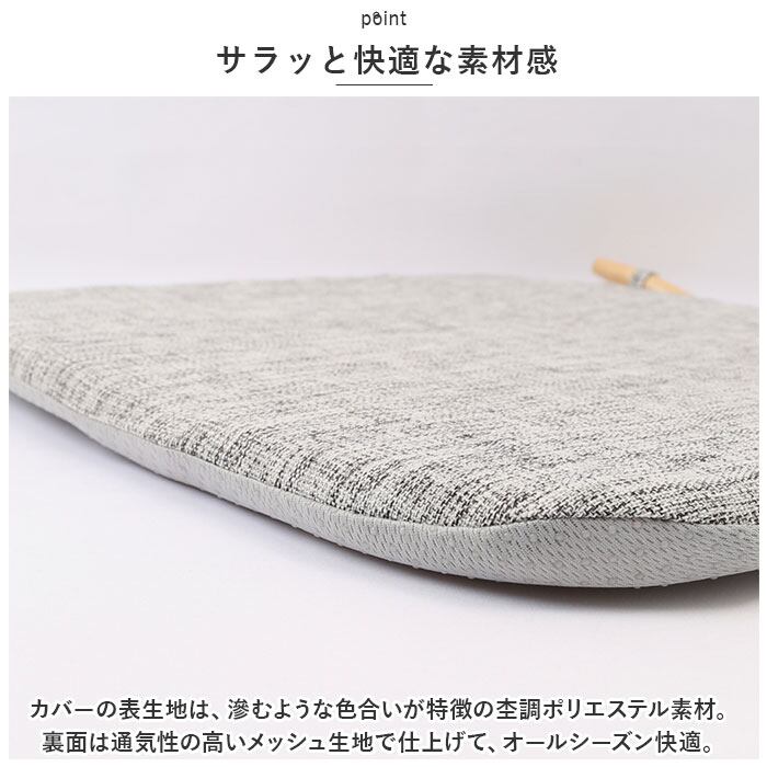 ・カバーの表生地は、滲むような色合いが特徴の杢調ポリエステル素材。裏面は通気性の高いメッシュ生地で仕上げて、オールシーズン快適。