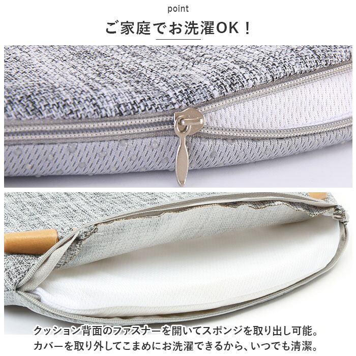 ・クッション背面のファスナーを開いてスポンジを取り出し可能。カバーを取り外してこまめにお洗濯できるから、いつでも清潔。