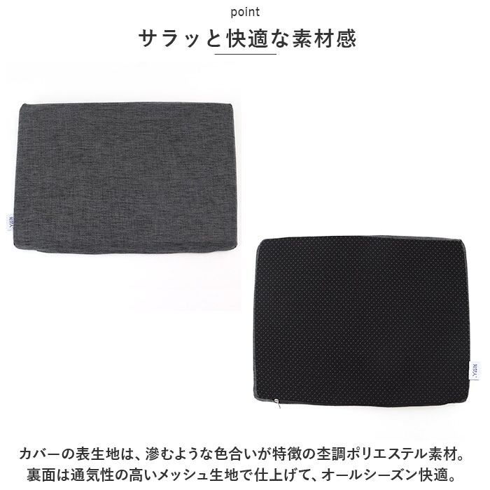 ・カバーの表生地は、滲むような色合いが特徴の杢調ポリエステル素材。裏面は通気性の高いメッシュ生地で仕上げて、オールシーズン快適。