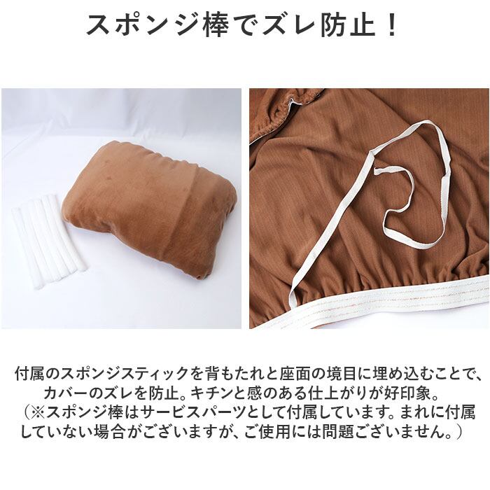 ・付属のスポンジスティックを背もたれと座面の境目に埋め込むことで、カバーのズレを防止。キチンと感のある仕上がりが好印象。(※スポンジ棒はサービスパーツとして付属しています。まれに付属していない場合がございますが、ご使用には問題ございません。)