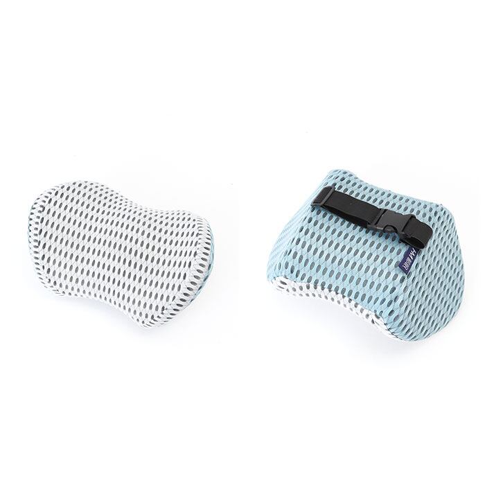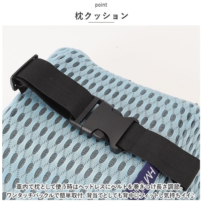 ・車内で枕として使う時はヘッドレスにベルトを巻きつけ長さ調節。ワンタッチバックルで簡単取付。背当てとしても背中にフィットし気持ちイイ♪