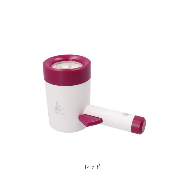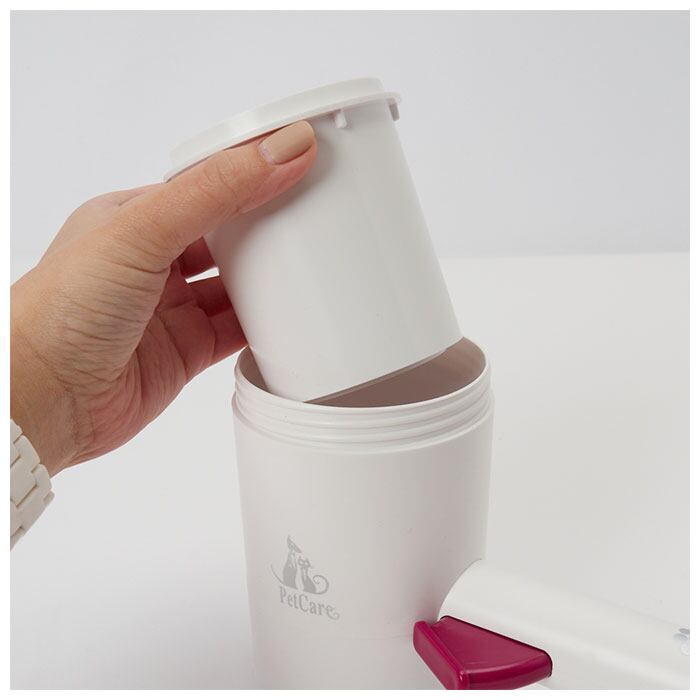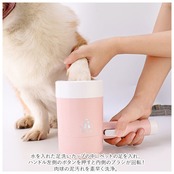 ・水を入れた足洗いカップの中にペットの足を入れ、ハンドル左側のボタンを押すと内側のブラシが回転!肉球の泥汚れを素早く洗浄。