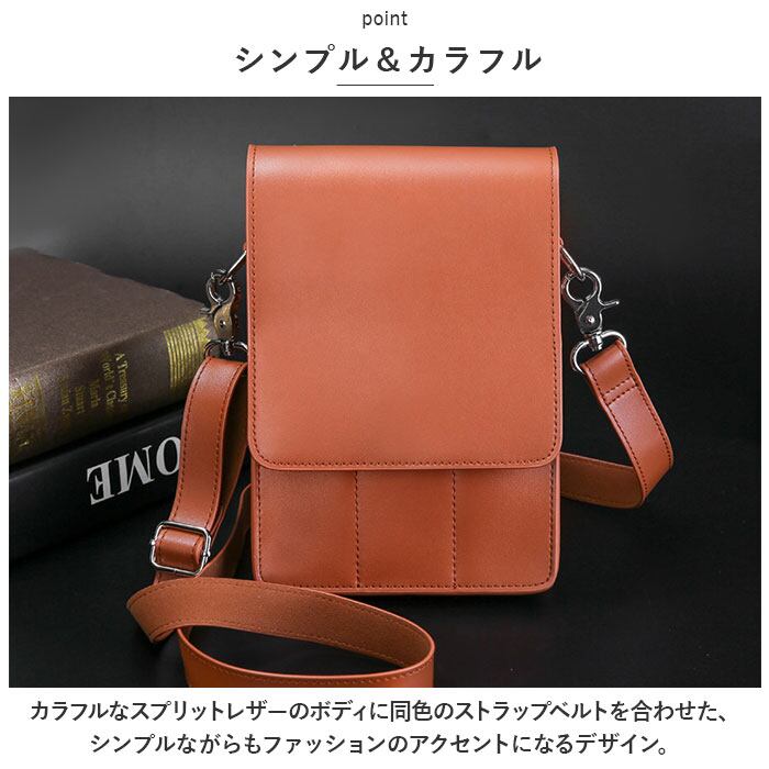 ・カラフルなスプリットレザーのボディに同色のストラップベルトを合わせた、シンプルながらもファッションのアクセントになるデザイン。