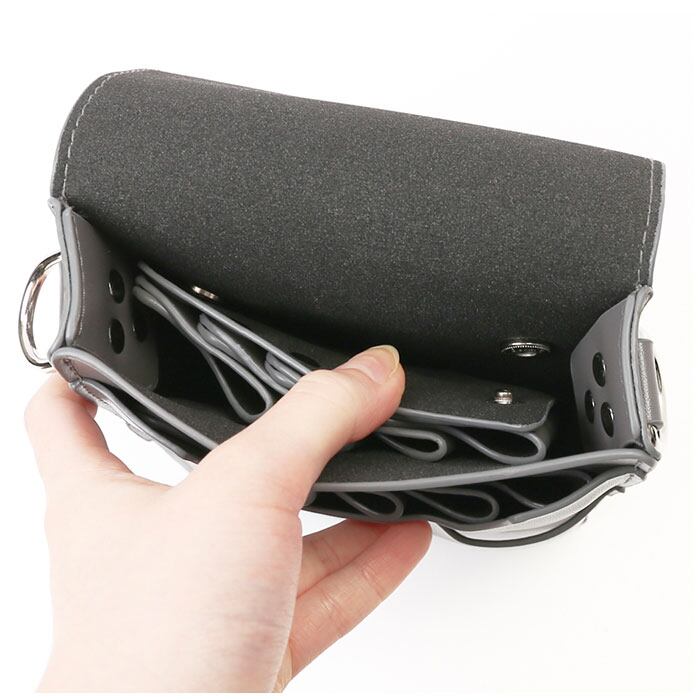 ・メインポケット内側のシザースロットは、スナップボタンで取り外せるセパレートタイプ。ブラシやコーム、ミニトリマーなど様々なツールをマルチに収納可能。