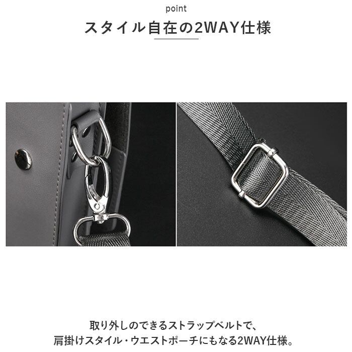 ・取り外しのできるストラップベルトで、肩掛けスタイル・ウエストポーチにもなる2WAY仕様。