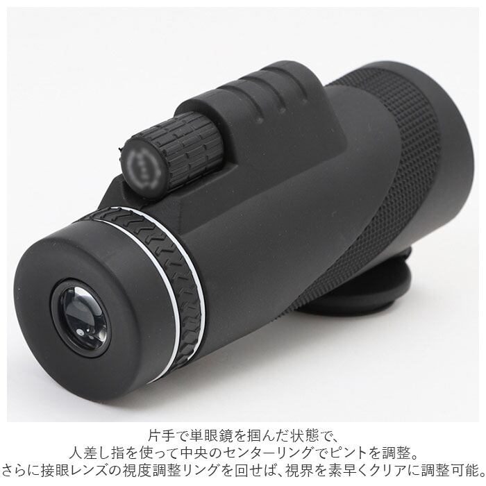 ・片手で単眼鏡を掴んだ状態で、人差し指を使って中央のセンターリングでピントを調整。さらに接眼レンズの視度調整リングを回せば、視界を素早くクリアに調整可能。