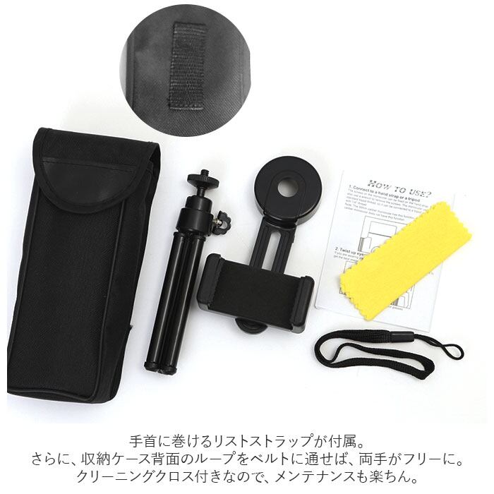 [付属品]単眼鏡収納袋、三脚、スマホアダプター、ストラップ、レンズ拭きクロス
