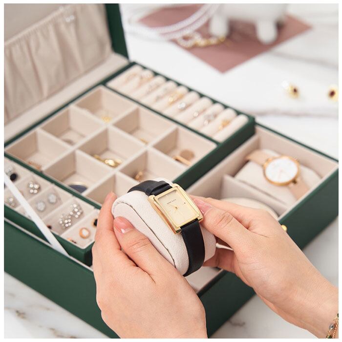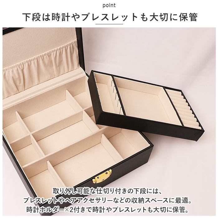 ・取り外し可能な仕切り付きの下段には、ブレスレットやヘアアクセサリーなどの収納スペースに最適。時計ホルダー×2付きで時計やブレスレットも大切に保管。