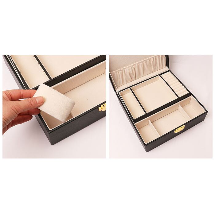・上段は、細かくて紛失しやすいアクセサリーが一目瞭然。取り外し可能な6つ穴&スリット付きプレート×5と、リングを保管するのに便利な9つの仕切りを装備。中央の小物スペースは仕切りを取り外して大きめのブローチも収納可能に。アレンジ可能でたっぷり収納出来るのが嬉しい♪