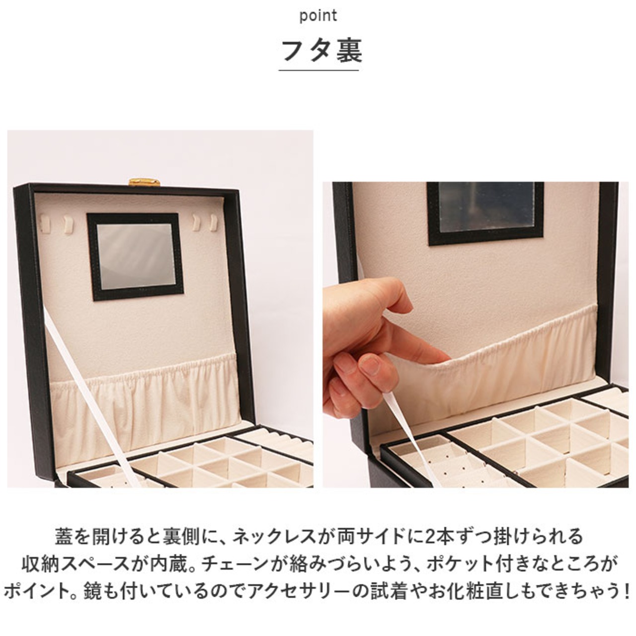 ・蓋を開けると裏側に、ネックレスが両サイドに2本ずつ掛けられる収納スペースが内蔵。チェーンが絡みづらいよう、ポケット付きなところがポイント。鏡も付いているのでアクセサリーの試着やお化粧直しもできちゃう!