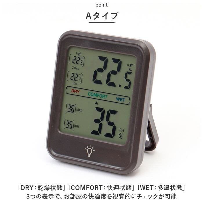 ・液晶画面がくっきり見やすい、シンプルな『Aタイプ』と、快適湿度をスマイルフェイスが教えてくれる『Bタイプ』の2種類からチョイス可能。