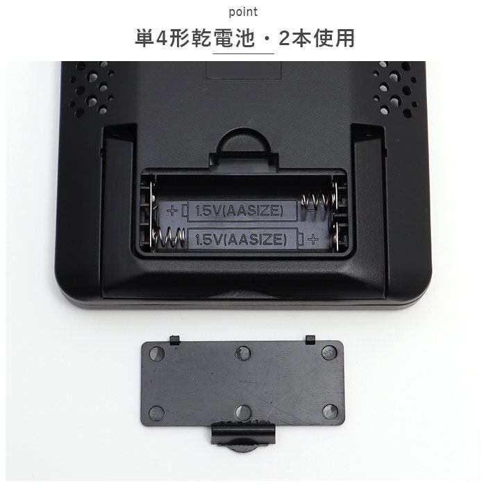 ・離れたところからでも見やすい大きめの文字で、上段に室内の「温度」、下段に「湿度」を表示したシンプルデザイン。