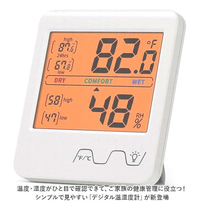 ・温湿度計前面の切り替えボタンで、お住いの地域に合わせて、華氏表示(°F)と摂氏表示(°C)を切り替え可能。