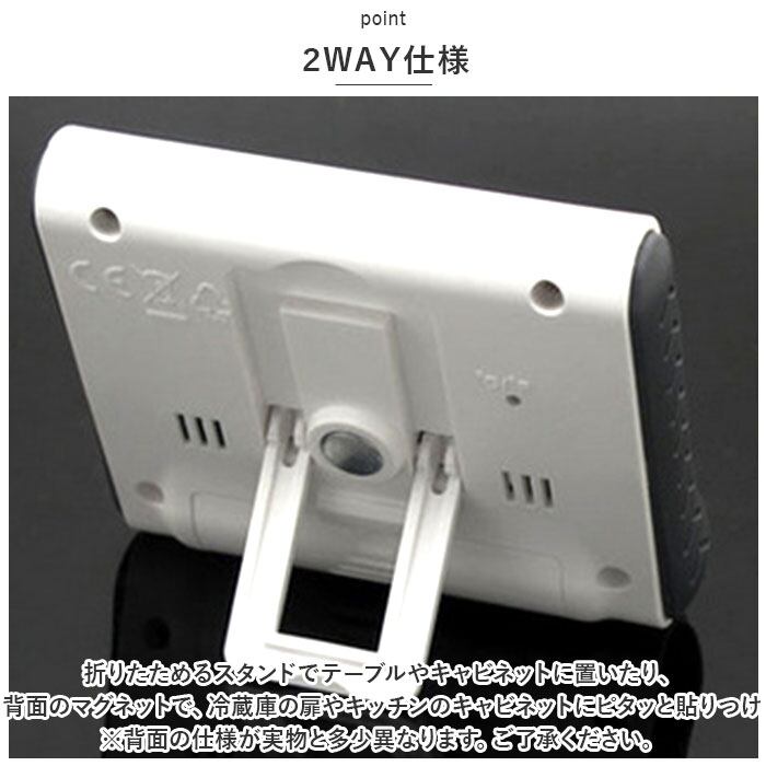 ・折りたためるスタンドでテーブルやキャビネットに置いたり、背面のマグネットで、冷蔵庫の扉やキッチンのキャビネットにピタッと貼りつけて使える2WAY仕様。