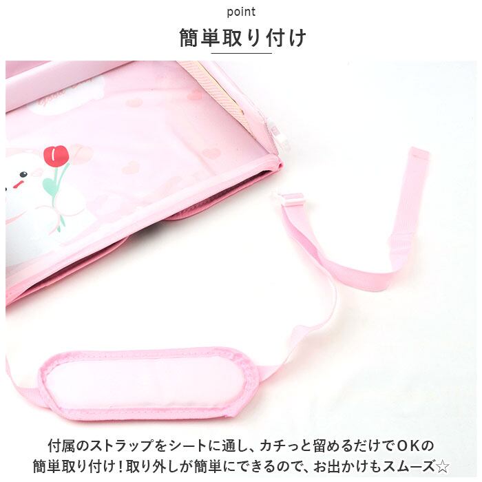 ・付属のストラップをシートに通し、カチっと留めるだけでOKの簡単取り付け!取り外しが簡単にできるので、お出かけもスムーズ☆